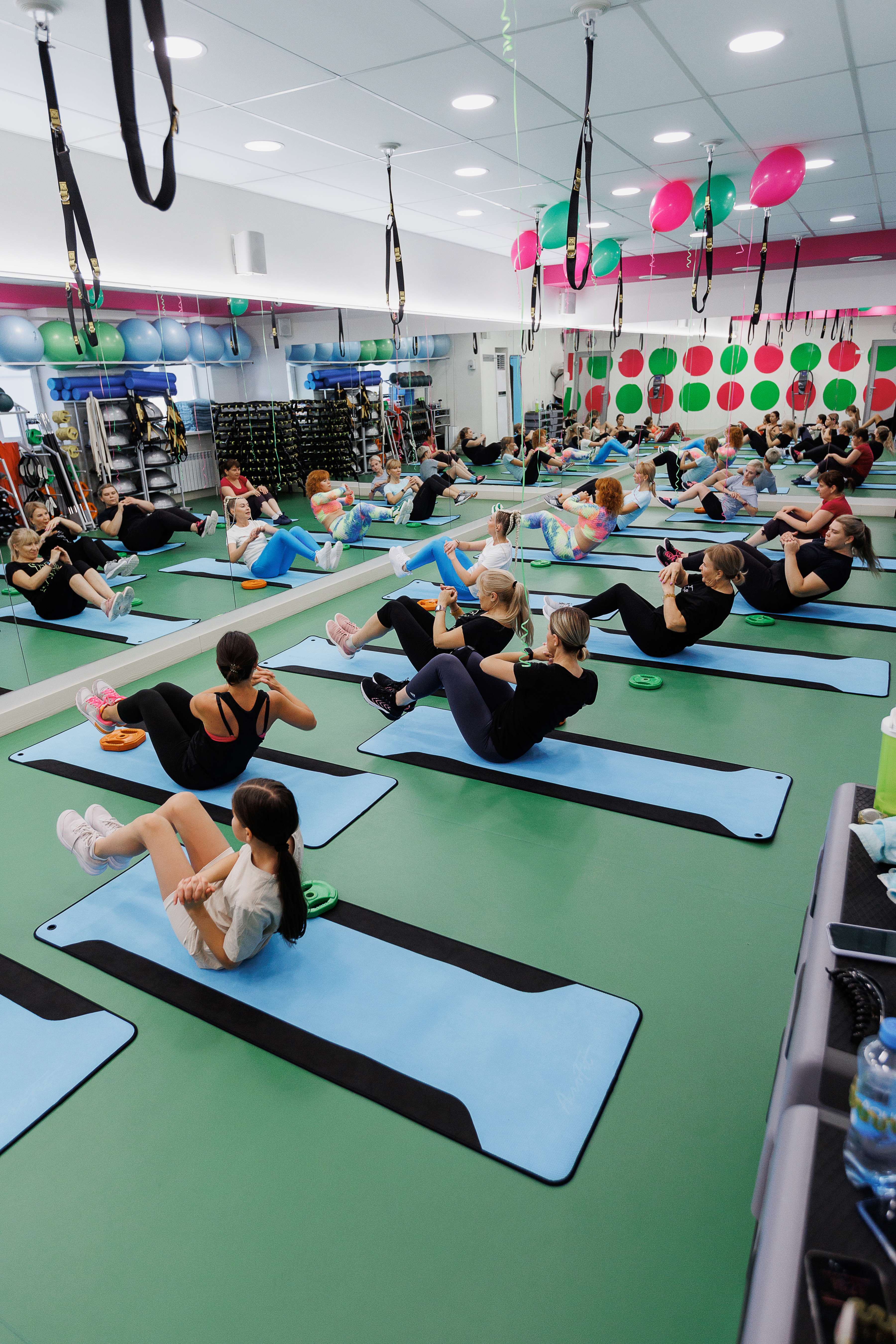 Тренажёрный зал разделён на 3 зоны: кардио зона, зона свободных весов и блочных тренажеров, зона функционального тренинга.